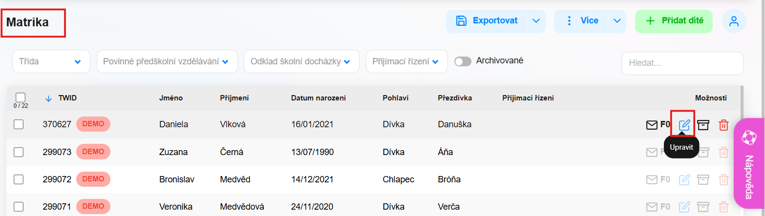 V posledním kroku je nutné zkontrolovat nastavení dítěte.- V sekci Matrika vybereme konkrétní dítě.