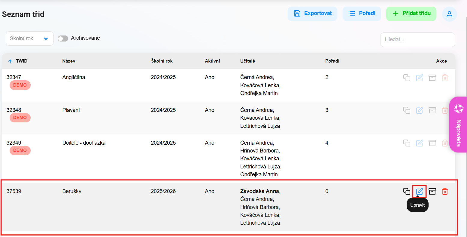 Přes ikonu Upravit se dostaneme do nastavení třídy.