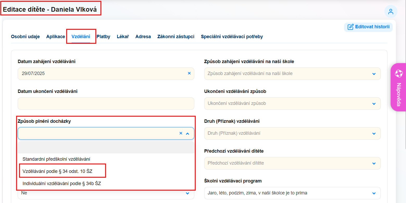- V záložce Vzdělávání zkontrolujeme položku Způsob plnění docházky.